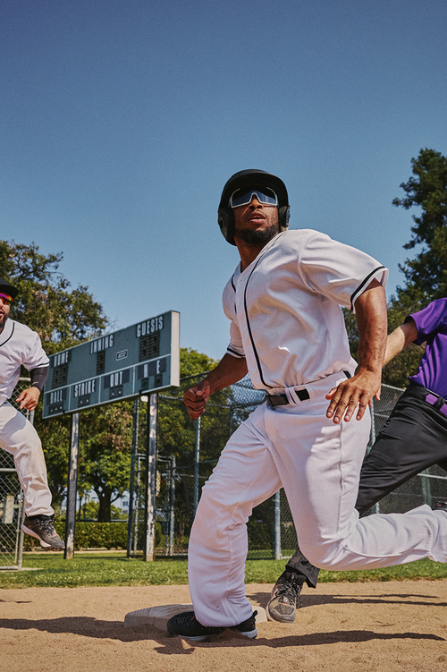 View full detailsTAG, you're IT in these purple shield sunglasses w/ half-rim frames & light pink reflective lenses. Channel your inner cephalopod's athletic ab...